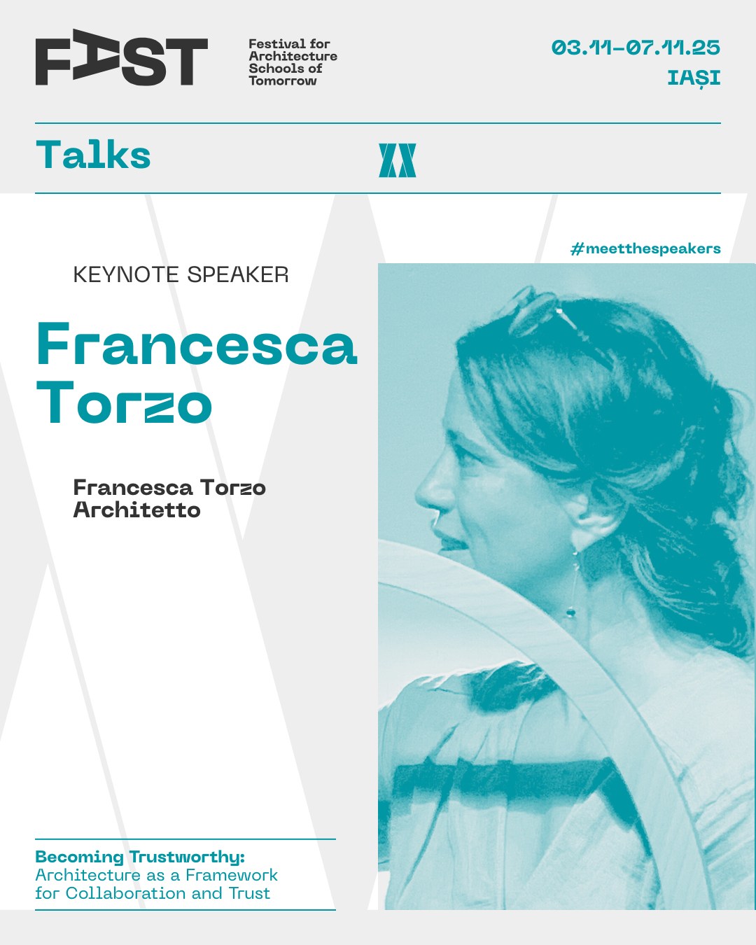 Alla terza edizione del Festival for Architecture Schools of Tomorrow – FAST, in programma a Iași dal 3 al 7 novembre 2025, è invitata anche l’architetta italiana Francesca Torzo che parteciperà il 5 novembre alle ore 18.30, alla seconda serata della serie TALKS che si terrà presso l’Opera Nazionale di Iași, proseguendo l’esplorazione di FAST 2025 su “L’architettura come quadro di riferimento per la collaborazione e la fiducia”. Sono previste le presentazioni di Francesca Torzo, fondatrice di Francesca Torzo Architetto, e Pablo Allard, Preside della Facoltà di Architettura e Arti dell’Universidad del Desarrollo in Cile. Attraverso le loro diverse pratiche – radicate nell’artigianato, nella sensibilità dei materiali e nell’impegno sociale – entrambi gli architetti rifletteranno su come l’architettura possa alimentare fiducia, identità e resilienza all’interno delle comunità. Sarà un invito al dialogo sulla continuità culturale, la ricostruzione e i valori condivisi che definiscono la progettazione responsabile oggi.