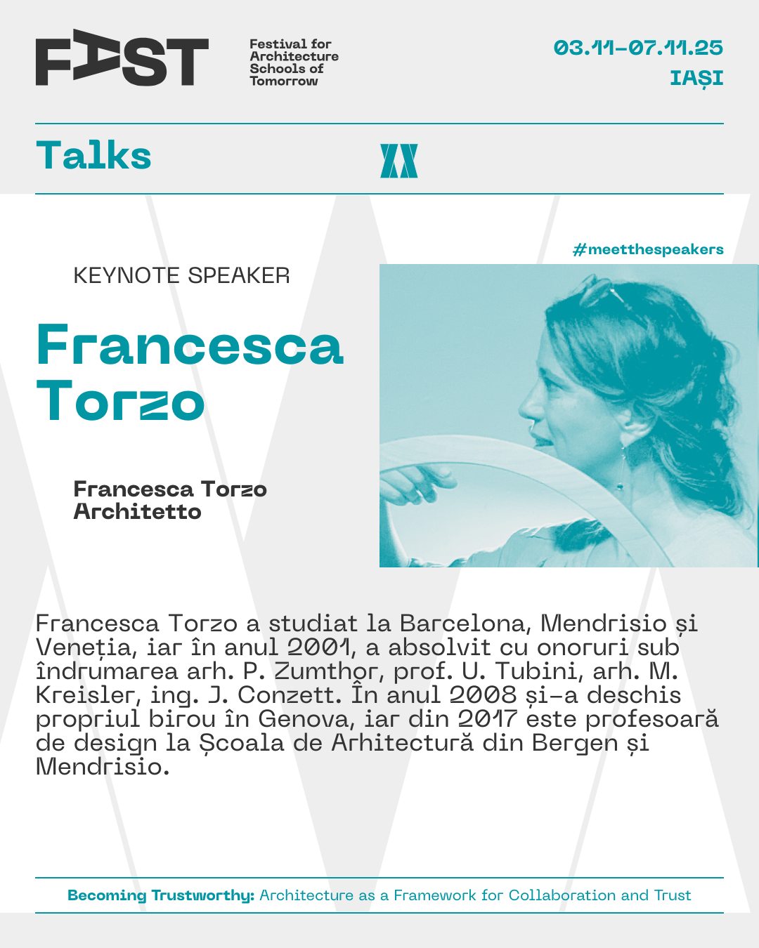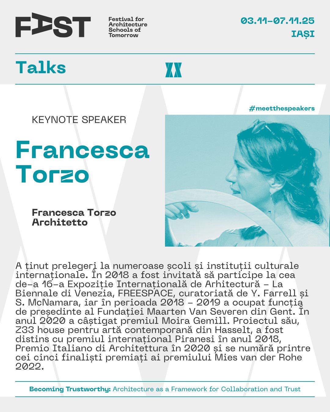 La cea de-a treia ediție a Festival for Architecture Schools of Tomorrow – FAST, care se va desfășura la Iași în perioada 3 – 7 noiembrie 2025, printre invitați se numără și arhitecta italianăFrancesca Torzo care va participa în data de 5 noiembrie la ora 18.30, la cea de-a doua seară din seria TALKS care va avea loc la Opera Națională din Iași, continuând explorarea de către FAST 2025 a „Arhitecturii ca și cadru pentru colaborare și încredere”. Această ediție include prezentări susținute de Francesca Torzo, fondatoarea Francesca Torzo Architetto, și Pablo Allard, decanul Facultății de Arhitectură și Arte de la Universidad del Desarrollo din Chile. Prin practicile lor distincte – bazate pe măiestrie, sensibilitate materială și implicare socială – ambii arhitecți vor reflecta asupra modului în care arhitectura poate cultiva încrederea, identitatea și reziliența în cadrul comunităților. Va fi o invitație la dialog despre continuitatea culturală, reconstrucție și valorile comune care definesc astăzi designul responsabil.